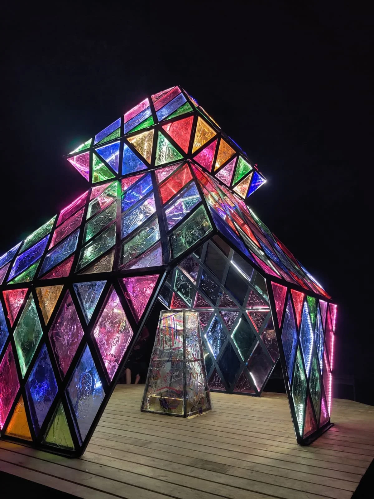 Welcome Beacon is a twelve feet tall structure covered in colorful translucent modular tiles and internally divided into eight zones using proximity sensors. The piece reacts differently to the sun than when it is night time, giving those interacting with it different experiences. During the day, for instance, sunshine will stream through the tiles creating a prismatic stained glass effect which will change with the sun.